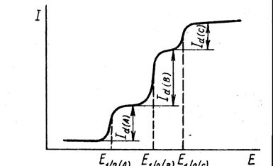 Рис. 26. Полярограмма при наличии в растворе трёх восстанавливающихся ионов.