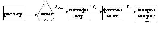 Принцип метода заключается в следующем. Анализируемый раствор распыляют в виде аэрозоля в пламя горелки. Возникающее излучение определяемого элемента отделяется от постороннего с помощью светофильтра и, попадая на фотоэлемент, вызывает фототок, который измеряется с помощью микроамперметра (рис. 35).