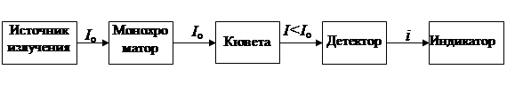Общий принцип работы любого прибора абсорбционной спектроскопии заключается в следующем. Поток света от внешнего источника излучения проходит через монохроматизатор. Монохроматический поток света проходит через кювету с раствором и попадает на детектор, который преобразует световую энергию в электрическую. Затем с помощью измерительного устройства регистрируют отношение фототоков в виде оптической плотности А или пропускания Т.