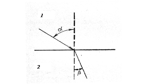 Если луч проходит из среды (1) с меньшей преломляющей способностью в среду (2) с большей преломляющей способностью, то угол падения α будет больше угла преломления β (рис.).