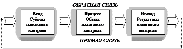 Сущность налогового контроля можно рассматривать с двух позиций: во-первых, как функцию или элемент государственного управления экономикой, во-вторых, как особую деятельность по исполнению налогового законодательства. Следует отметить, что эти стороны налогового контроля находятся в неразрывном единстве, что позволяет представить налоговый контроль в виде классической кибернетической системы, сочетающей в себе разнообразие статических элементов и их динамическое взаимодействие, непрерывное развитие и совершенствование. Взаимодействие между субъектом и объектом налогового контроля носит характер прямой и обратной связи, которые можно отобразить схематично следующим образом:
