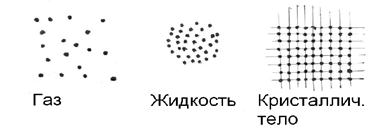 Если в газах молекула до столкновения с другой молекулой совершает некоторую длину свободного пробега, намного превышающий размер самой частицы, то в жидкостях дело обстоит немного по-другому. Г, Ж и крист. состояния различаются и степенью упорядоченности пространственного расположения частиц.