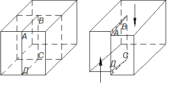 Образующаяся при этом сдвиге ступенька на верхней грани не проходит через всю ширину кристалла, а оканчивается в точке В. В результате такой операции куб. решетка выглядит так: