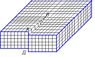 После сдвига кристалла по плоскости АВСД вдали от линии ВС решетка остается совершенной, а вблизи от линии ВС вдоль нее тянется область несовершенства.