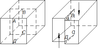 , направленная сверху вниз и снизу вверх показывает сдвигающее напряжение, приложенное к части кристалла левее ABCD.