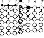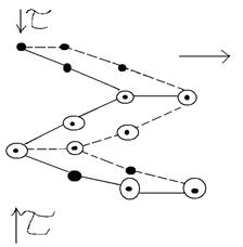 Рассмотрим атомный механизм перемещения винтовой дислокации. На рисунке расположение атомов показано в 2-х вертикальных плоскостях проходящих непосредственно по обе стороны от плоскости сдвига АВСД на предыдущем рисунке.
