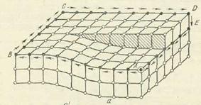 От точки А пройдем влево 7 межатомных расстояний до точки В, 6 межатомных расстояний до С вверх и вправо 7 до Д. Но для того, чтобы вернуться в А, в точке Е нужно совершить скачок на одно межатомное расстояние вниз. Т.о. и в этом случае вектором, ликвидирующим разомкнутость контура Бюргерса, является вектор Бюргерса. Направление последнего зависит от направления обхода по контуру Бюргерса. Следовательно, в понятии вектора Бюргерса содержится неопределенность, но этот недостаток не является существенным. Вектор Бюргерса (