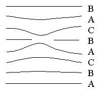 Положение соседних лунок 2-го слоя не идентично по отношению к 1-му одни лунки во втором слое находятся над атомами А из 1-го слоя, а другие над С 1-го слоя. Поэтому возможны 2 варианта укладки 3-го слоя: