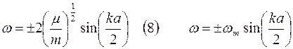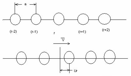 Атомы, имеющие массу m, расположены на расстоянии, а друг от друга. Для этой последовательности смещение атомов V, создаваемое волной, имеет смысл только в точках расположения атомов и не имеет смысла в промежуточных точках. Поэтому, смещение r -го атома записывается