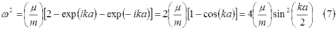 Получили дисперсионное уравнение для продольных волн, распространяющихся вдоль линейной одноатомной цепочки, где учитывалось взаимодействие только с ближайшими соседями
