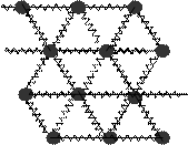 Частицы, находящиеся в узлах кристаллической решетки, участвуя в тепловом движении, колеблются около положения равновесия. Амплитуда ~ 0,1 А° (5 – 7 % от расстояния между частицами). Колеблющаяся частица взаимодействует с соседями (рис.2.2). Колебания между частицами распространяются в виде волн. Полная остановка атомов с обращением их энергии в нуль, в силу законов квантовой механики невозможна, и они при Т = 0 К совершают «нулевые» колебания.