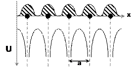 Однако для электрона, движущегося в периодическом поле кристалла, вероятность обнаружения его в данном месте кристалла должна быть периодической функцией, зависящей от координаты x. Периодичность функции кратна постоянной решетки а. Различными вероятностями будут обладать только положения электрона в пределах одного периода, т.е. амплитуда волновой функции электрона, движущегося в периодичном поле, не остается постоянной, а периодически меняется с периодом, равным периоду решетки а. Обозначим эту амплитуду U(x). Тогда волновая функция электрона, движущегося в периодическом поле кристалла в направлении x, будет: