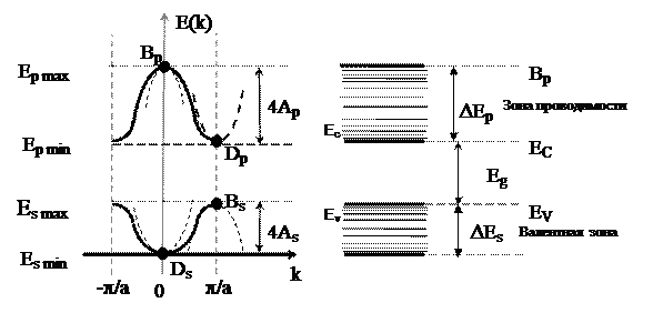 - для s зон Es(k)=E`s – 2Ascos(ka) (4.10)