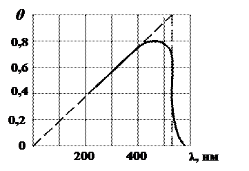 На рис. 4.24 приведена зависимость θ от длины волны возбуждающего света. В некотором интервале длин волн энергетический выход люминесценции растет пропорционально длине волны, а затем резко падает до нуля. Это закономерность была установлена С. И. Вавиловым и носит название закона С. И. Вавилова. По абсолютному значению энергетический выход может достигать 80% и более.