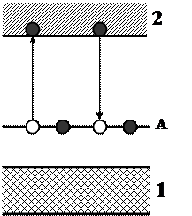 На рис. 4.25 показана схема энергетических зон флуоресцирующего люминофора. Между целиком занятой зоной 1 и свободной зоной 2 располагаются примесные уровни активатора А. При поглощении атомом активатора фотона hv электрон с примесного уровня А переводится в свободную зону 2. Становясь электроном проводимости, он свободно блуждает по объему кристалла до тех пор, пока не встретится с ионом активатора и не рекомбинирует с ним, перейдя вновь на примесный уровень A. Рекомбинация сопровождается излучением кванта флуоресцентного свечения. Время высвечивания люминофора определяется временем жизни возбужденного состояния атомов активатора, которое не превышает обычно миллиардных долей секунды. Поэтому свечение является кратковременным и исчезает почти вслед за прекращением облучения тела.