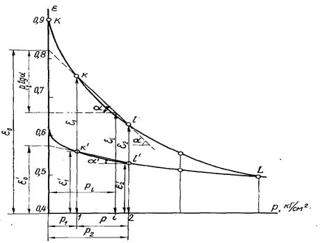Если ограничиться небольшим изменением давлений (порядка 1-3 кГ/см2 , что обычно и имеет место в основаниях сооружений), то с достаточной для практических целей точностью можно принять отрезок kl компрессионной кривой (рис 7.3.) за прямую.