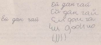 1 балл — имитация, которую можно прочитать. Буквы могут в два раза по величине превосходить те, что на образце (но не больше). Буквы образуют три слова. Предложение отклонено от прямой линии не больше чем на 30°.