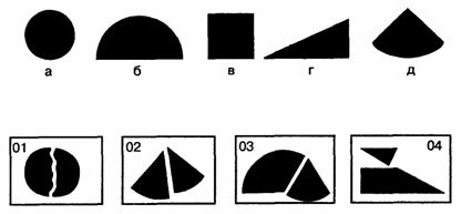 В каждом задании вам предлагается одна фигура, разбитая на несколько частей. Эти части даются в произвольном порядке. Соедините мысленно части, и ту фигуру, которая у вас при этом получится, найдите в ряду фигур а), б), в), г), д).