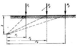 Для нескольких сосредоточенных сил, приложенных к поверхности в разных точках, вертикальное сжимающее напряжение в любой точке массива для горизонтальных площадок, параллельных ограничивающей плоскости, определяется простым суммированием. Таким образом, напряжение в точке М, расположенной на глубине z на расстояниях ri от точек приложения нагрузки определяется по формуле: