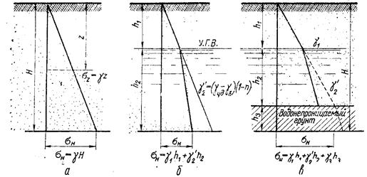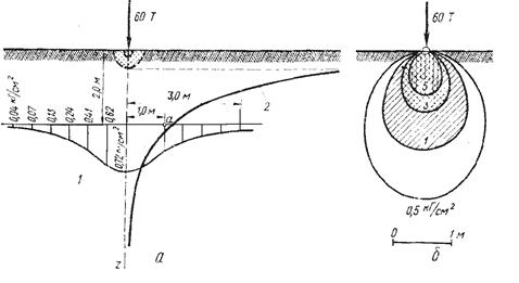 Рис. 11.3. Эпюры горизонтальных и вертикальных внутренних напряжений (а), изобары (линии равных напряжений) – (б) в массиве грунта.
