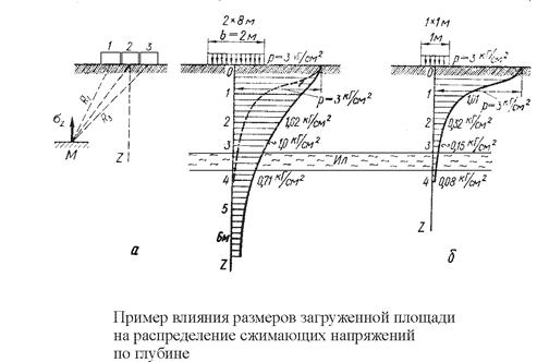 Строгое решение существует только для прямоугольной площади загрузки, деформации которой соответствуют деформации поверхности линейно деформируемого полупространства. Определяют 2 типа сжимающих напряжений: