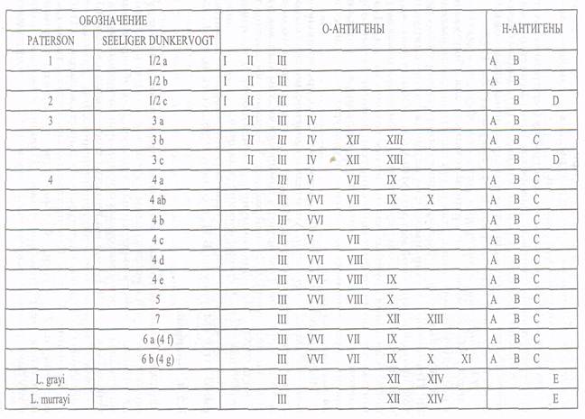 Распределение серотипов по видам рода Listeria следующее: L.monocytogenes — 1/2А, 1/2В, 1/2С, 3А, 3В, 3С, 4А, 4АВ, 4С, 4D, 4F, «7»; L. ivanovii -5; L. innocua -4AB, 6А, 6В; L. weishimeri -6A, 6B;