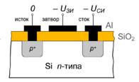 В МДП-транзисторах со встроенным каналом у поверхности полупроводника под затвором при нулевом напряжении на затворе относительно истока существует инверсный слой — канал, который соединяет исток со стоком.