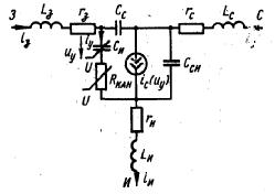 В схеме приняты следующие обозначения: L3, Lи, Lc — индуктивности выводов затвора, истока и стока; r з — сопротивление потерь в металле затвора; rи и rс — сопротивления потерь неуправляемых участков канала со стороны истока и стока; Си, Сс —емкости обедненного слоя под затвором со стороны истока и стока; Rкан — сопротивление управляемой части канала и переходного слоя между каналом и обедненной областью со стороны истока (аналогичным сопротивлением со стороны стока пренебрегаем из-за его малости по сравнению с сопротивлением емкости Сс); Сси — емкость между контактами сток — исток. Свойства полевого транзистора как АЭ отражены включением в схему генератора тока ic, зависящего от управляющего напряжения иу на емкости Си.