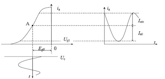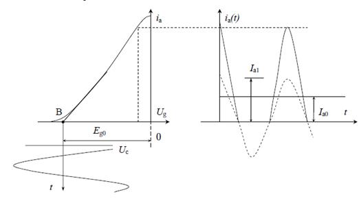 При подаче переменного напряжения на вход АЭ рабочая точка будет изменять своё положение, перемещаясь по ломаной линии А1ВС1. Наклон участка А1В к оси абсцисс зависит от сопротивления нагрузки АЭ R н: чем больше R н, тем меньше угол наклона. При этом выходной ток i а (t) имеет форму косинусоидальных импульсов. Напряжение на аноде изменяется с противоположной фазой с входным напряжением. Ломаная линия А1ВС1 называется динамической характеристикой усилителя.