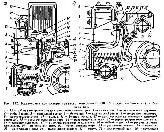 Индивидуальные контакторы по сравнению с групповыми имеют простую конструкцию, однако применение их значительно усложняет цепи управления из-за необходимости иметь большое число блок-контактов для обеспечения последовательности срабатывания контакторов. Поэтому применение групповых контакторов позволяет значительно сократить число электрических блокировок (последовательность замыкания и размыкания контактов обеспечивается разверткой кулачковых шайб), упростить электрические цепи, повысить их надежность и уменьшить размеры контроллера машиниста.