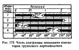 Конфигурация кулачков, относительное расположение их иа валу, взаимодействие с приводом и контакторами в целом задаются диаграммой замыкания контакторов. На диаграмме показано, какие контакторы должны быть замкнуты и какие разомкнуты иа каждой позиции аппарата, а также последовательность замыкания и размыкания контакторов при переходе с одной позиции на другую. Обычно на таких диаграммах черные полосы соответствуют положениям вала, на которых данные контакторы полностью замкнуты (рис. 173), белые концы у этих полос — углам поворота вала, в пределах которых происходит притирание контактов, толстые линии — периоду перемещения подвижных контактов до соприкосновения с неподвижными, отсутствие полос и линий — положению полного выключения контактов. Вертикальными линиями отмечены позиции, фиксируемые приводом. Диаграммы используют также для проверки правильности сборки группового аппарата и допустимости износа его частей в эксплуатации.