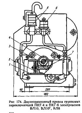 Он имеет два фиксированных положения, соответствующих двум соединениям тяговых двигателей. В двухпози-ционном приводе имеется один цилиндр / (рис. 174) с двумя поршнями 2 и зубчатой рейкой 7, связанной с шестерней