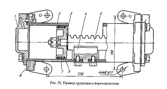 Привод группового переключателя (рис. 75) двухпозиционный. Цилиндр привода представляет собой стальную трубу 2, на концах которой напрессованы и приварены держатели 8, служащие для крепления крышек к цилиндру и самого цилиндра к каркасу аппарата.