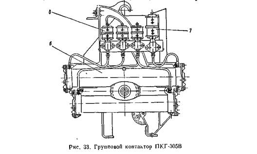 На электровозах, не имеющих рекуперативного торможения, установлен групповой контактор типа ПКГ-323, аналогичный по конструкции и отличающийся от описанного меньшим количеством контакториых элементов (четырнадцать) и иной разверткой вспомогательного барабана и кулачкового вала.