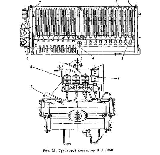 Корпус группового контактора ПКГ-305В (рис. 33) состоит из двух литых стальных рам У, соединенных между собой уголками. На корпусе установлены восемнадцать контакторных элементов 2 типа КЭ-1, кулачковый вал 3, блокировочный барабан 4 с пальцами 5, два пневматических цилиндра 6 и четыре электромагнитных вентиля 7 и 8.