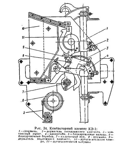 Контакторный элемент КЭ-1 (рис. 34) состоит из стального четырехгранного стержня /, опрессованного составной изоляцией, держателя неподвижного контакта 2, отлитого совместно с дугогасительным рогом, кронштейна 4, с которым шарнирно соединен контактный рычаг 3 с роликом.