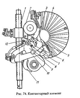 На нижнем кронштейне шарнир-но закреплен латунный контактный рычаг 8. Подвижной контакт 5 закреплен на держателе 6, ось которого связана с контактным рычагом. Для прохождения тока на держателе закреплен гибкий кабель, который подсоединен к выводу на кронштейне 10.
