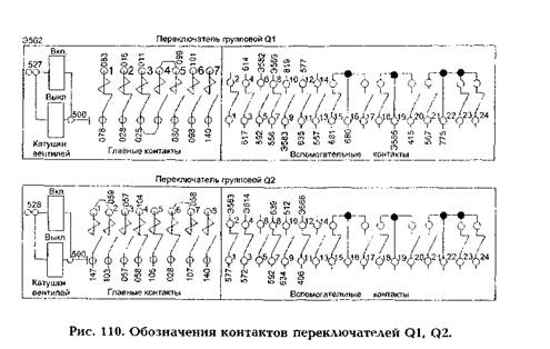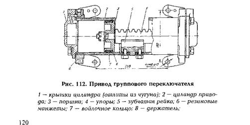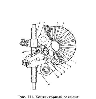 1 — контакторные элементы (см. рис.11); 2 — асбестоцементные перегородки; 3 — сварной каркас; 4 — кулачковый вал; 5 — пневматический двухпозиционный привод (см. рис. 112); 6 — шестерня; 7 — вспомогательные контакты; 8 — контактные пальцы; 9— держатель; 10 — воздухораспределитель (включающий и выключающий электромагнитные вентили).