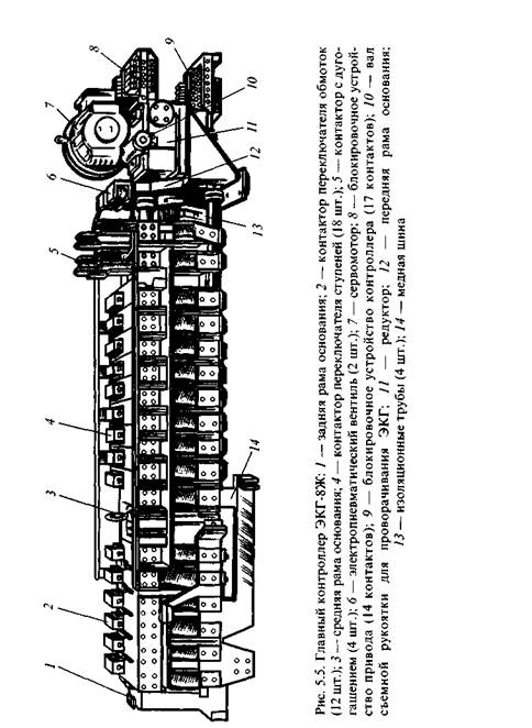 Главный контроллер типа ЭКГ-8Ж (в схеме электровоза на рис. 8.2 обозначен ГП, вкладка) служит для переключения под нагрузкой тяговых вторичных обмоток трансформатора, с целью изменения напряжения, подводимого к ТЭД электровоза.