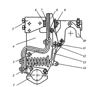Контактор без дугогашения — 30 шт. (12 шт. для ПО, 18 шт. для ПС) (рис. 5.6) состоит из двух изоляционных боковин (пресс-материал АГ-4), между которыми вверху жестко укреплен неподвижный силовой контакт. В средней части между боковинами шарнирно укреплен латунный рычаг в виде коромысла. На верхней части рычага жестко укреплен подвижный силовой контакт с шунтом. На нижнем конце рычага укреплен ролик, против которого находится кулачковая шайба вала ПО или вала ПС. С другой стороны в нижний конец рычага упирается сжатая включающая пружина. Собранный контактор крепится на двух изолированных трубах основания ЭКГ с помощью нижнего хомута с двумя болтами и верхнего прижима с болтом.
