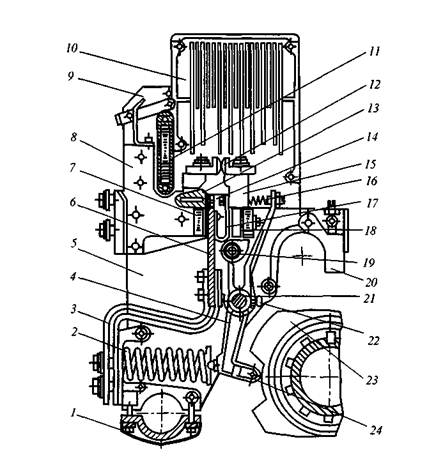 Силовой контактор ЭКГ с дугогашением: 1 — хомут для крепления контактора к нижней трубе основания; 2 — включающая пружина; 3 — гибкие медные шунты; 4 — латунный рычаг; 5 — изоляционная боковина (2 шт.); б — подвижный контакт рычага; 7 — якорь электромагнитного компенсатора; 8 — контактодержатель; 9 — дугогасительная катушка; 10 — дугогаси-тельная камера; // — сердечник дугогасительной катушки; 12 — дугогаси-тельные контакты; 13 — канал для подачи воздуха с целью гашения дуги; 14 — главные контакты; 15 — рычаг подвижных контактов; 16 — притирающая пружина; 17 — гибкий шунт; 18 — ярмо электромагнитного компенсатора; 19 — ось с резиновой втулкой; 20 — прижим для крепления контактора к верхней трубе основания; 21 — ось латунного рычага; 22 — стопорный винт; 23 — кулачковая шайба; 24 — ролик рычага