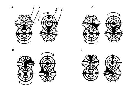 Положение мальтийских механизмов при переключении ЭКГ с одной позиции на другую: а — исходная позиция; б — после первого такта; в — после второго такта; г — после третьего такта; 1 — мальтийский крест № 1; 2 — двухпальцевый поводок; 3 — однопальцевый поводок; 4 — мальтийский крест № 2