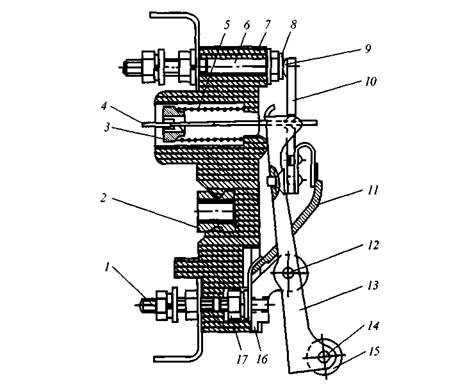Блокировочный контакт типа КЭ-20: 1 — шпилька; 2 — гайка; 3 — держатель стержня; 4 — стержень; 5 — включающая пружина; б — держатель неподвижного контакта; 7 — изоляционное основание; 8 — серебряная накладка неподвижного контакта; 9 — серебряная накладка подвижного контакта; 10 — держатель подвижного контакта; 11 — гибкий шунт; 12 — ось рычага; 13 — рычаг; 14 — ось ролика; 15 — ролик рычага; 16 — стойка рычага; 17 — гайка