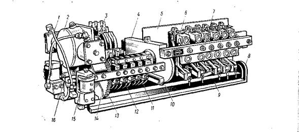 / — воздухопровод; 2 — пневматический привод; 3 — кулачковые контакторы переключателя вентилей; 4, 8, 14 — поперечные рамы; 5 — изоляционная перегородка; в — кулачковый силовой контактор; 7 — текстолитовая рейка; 9 — стальной уголок; 10 — механический фиксатор; // — кулачковый контактор управления; 12 — стальная рейка; 13 — зубчатая передача; 15 — электропневматический вентиль; 16 — регулировочный винт.