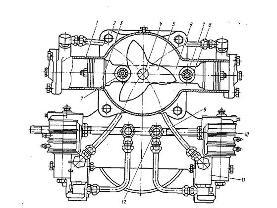 /—цилиндр; 2 - подшипниковый щит; 3 — поршень; 4 -валик; 5 — звезда; 6 — шток; 7 — ролики; «--игольчатый подшипник; 9- воздухопровод; 10 - электропневматический вентиль; // коллектор: I2 регулировочный болт.