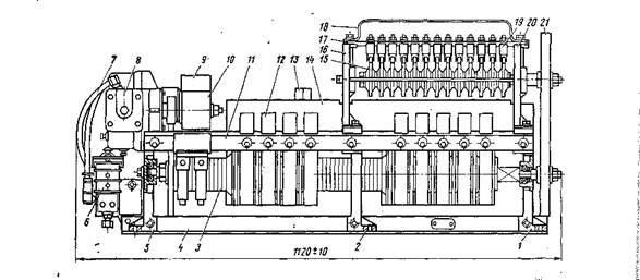 /, 2, 5, 16, 20 — поперечные рамы; 3 — главный кулачковый вал; 4 — стальной уголок; б — электропневматический вентиль; 7— воздухопровод; 8 — привод; 9 — диск; 10 — герконовый переключатель вентилей; И — текстолитовая рейка; 12 — кулачковый силовой контактор; /3 — кулачковый силовой контактор с дугогашением; 14 — изоляционная перегородка; 15 — кулачковый вал контакторов управления; П — стальная рейка; 18 — скоба; 19 — кулачковый контактор управления; 21 — текстолитовые шестерни.