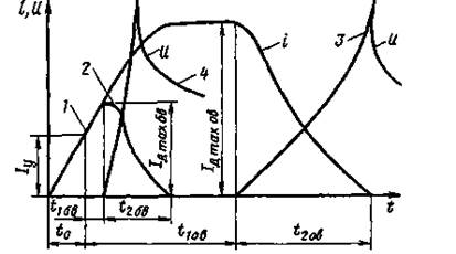 выключателей собственное время составляет 0,002 — 0,008 с, у обычных оио находится в пределах 0,02 — 0,08 с. Величины t2oB и *2бв зависят от эффективности применяемого дугогасительного устройства, индуктивности цепи и максимального тока, достигаемого в процессе выключения. Для обыкновенных выключателей полное время отключения составляет 0,1—0,3 с, для быстродействующих — 0,02—0,06 с.