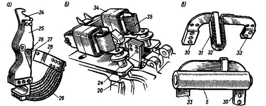 Рис.Контактный рычаг (а), размагничивающий виток, дугогасительная катушка с магнито-проводом (б) выключателя БВП-5 и индуктивный шунт (в) быстродействующих выключателей