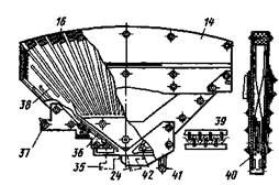Расположение рога неподвижного контакта в камере и небольшая ширина щели в нижней ее части обеспечивают ко уменьшает выход ионизированных газов из камеры вниз. Сужение щели и увеличение скорости движения дуги в нижней части камеры усилением магнитного дутья ускоряют деионизацию дуги, в связи с этим увеличивается скорость нарастания ее сопротивления в первый период после размыкания контактов. Чтобы уменьшить выхлоп пламени и ионизированных газов из камеры, в верхней ее части устанавливают деионную решетку, состоящую из отдельных элементов 16 (см. рис. 189). Каждый элемент деионной решетки представляет собой набор металлических пластинок, скрепленных двумя текстолитовыми планками и шпильками 15 и 17. На наружных стенках 14 камеры установлены стальные пластины 13. Благодаря съемным полюсам 12 и пластинам 13, установленным с обеих сторон дугогаси-тельной камеры, создается равномерное магнитное поле. Дугогасительную камеру крепят к раме валиком, входящим в отверстия шарнира 41, и тягой 18, которую закрепляют шарниром 37.