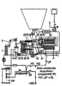 Выключение быстродействующего выключателя происходит при размыкании цепи удерживающей катушки 23 или кнопкой БВ по усмотрению машиниста или контактами соответствующих защитных аппаратов, включенных в цепь удерживающей катушки выключателя Быстродействующий выключатель отключается также при повышении тока защищаемой цепи до тока уставки. В том и другом случае выключение происходит вследствие того, что магнитный поток, замыкающийся через якорь, становится ниже определенного значения, при котором притягивающее усилие меньше усилия пружин 54. Якорь 46 отрывается от полюсов 44, и рычаг 58 якоря вместе с рычагом 25 подвижного контакта под действием пружин 54 устанавливается в отключенное положение. Таким образом, одни и те же пружины 54 замыкают главные контакты, создают необходимое контактное нажатие во включенном положении, когда якорь 46 удерживается полюсами 44, и перемещают подвижные детали, размыкая главные контакты, когда магнитный поток становится ниже определенного значения.